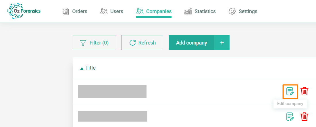 You can edit the company in the **Users** or **Companies** tab by clicking on the company in the list or on the **Edit company** button.