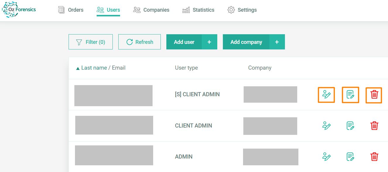 In the screenshot: button 1 – to edit a user, button 2 – to edit a company, 3 – to delete a user.