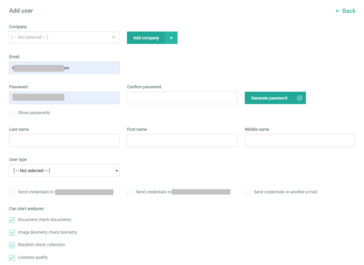 * **Company** – select from the dropdown menu. You can also add a company here by clicking the **Add company** button. You just need to fill in the **Company name** field in the new window and click **Submit**. Please note: ADMIN and OPERATOR can't belong to any company. If you choose a company for a user with one of these roles, it won't be saved.